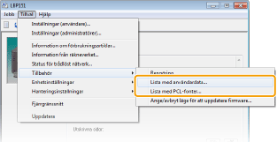 [Lista med användardata] eller [Lista med PCL-fonter].