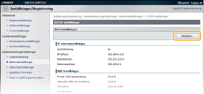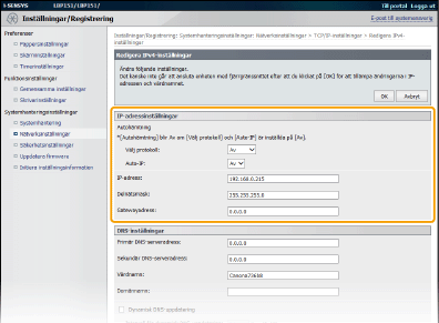 ![]() Även om Automatisk IP är valt åsidosätts adresser som har hämtats via Automatisk IP av IP-adresser som har tilldelats via DHCP/BOOTP/RARP. |