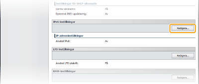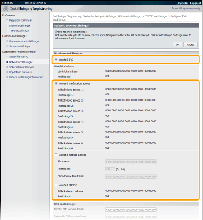 Använd Gränssnitt för fjärranvändning för att ange IPv6-adresser. Innan du anger IPv6-adresser ska du kontrollera att IPv4-adressen är rätt angiven (Visa nätverksinställningar). Du kan registrera upp till nio av följande IPv6-adresser.