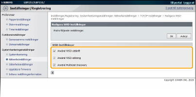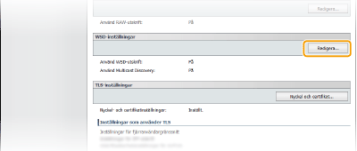 Markera kryssrutan om du vill hämta information om enheten från en dator via WSD. Kryssrutan markeras automatiskt när kryssrutan [Använd WSD-utskrift] markeras. [Använd Multicast Discovery]