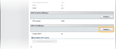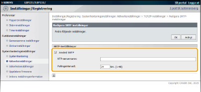 Testa kommunikation med NTP/SNTP-servernDu kan testa om enheten kommunicerar med den registrerade tidsservern via SNTP. Klicka på [Inställningar/Registrering]