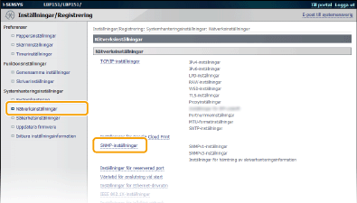 SNMP (Simple Network Management Protocol) är ett protokoll som används för att övervaka och styra kommunikationsenheter i ett nätverk med hjälp av en MIB-databas (Management Information Base). Enheten har stöd för SNMPv1 och säkerhetsutökad SNMPv3. Du kan kontrollera enhetens status från en dator när du skriver ut dokument eller använder Gränssnitt för fjärranvändning. Du kan aktivera antingen SNMPv1 eller SNMPv3 eller båda samtidigt. Ange inställningar för varje version så att de passar din nätverksmiljö och syftet med användningen.