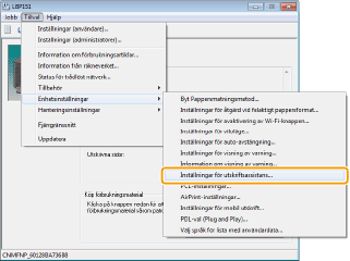 Använda tystgående läge för alla utskrifter![]() Du kan ställa in enheten så att den alltid skriver ut i tystgående läge. Ändra enhetens inställningar i skrivarstatusfönstret.