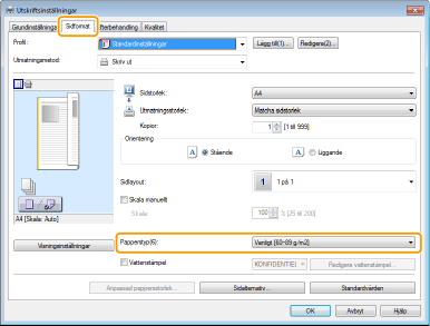 Ange före utskrift pappersstorleken och typen för papperet som ligger i papperskällan.