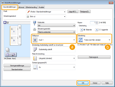 Du kan skriva ut flera sidor på ett enstaka ark. Du kan till exempel skriva ut fyra eller nio sidor på ett enstaka ark genom att använda [4 på 1] eller [9 på 1]. Använd den här funktionen om du vill spara papper eller visa dokumentet i miniatyrbilder.