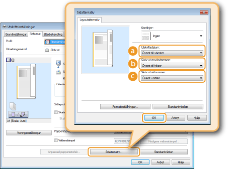 Välj utskriftsposition för utskriftsdatum, användarnamn eller sidnummer