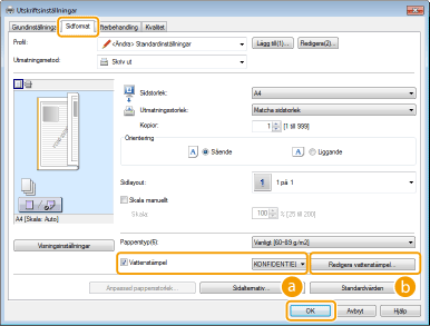 Du kan skriva ut vattenstämplar, till exempel "KOPIA" eller "KONFIDENTIELL" på dokumentet. Du kan skapa nya eller använda förregistrerade vattenstämplar.