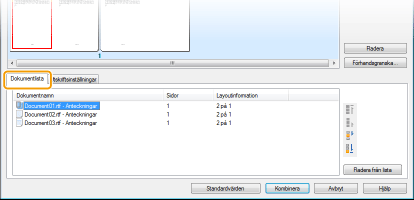 Klicka på fliken [Dokumentlista] för att visa de dokument som lagts till i steg 1 till 4. Du kan ta bort dokument genom att välja dem i listan och klicka på [Radera från lista].