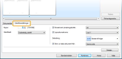 Klicka på fliken [Utskriftsinställningar] för att visa den skärm där du anger utskriftsinställningar, till exempel antal kopior eller enkelsidig/dubbelsidig utskrift. Inställningar som görs här används under hela utskriftsjobbet.