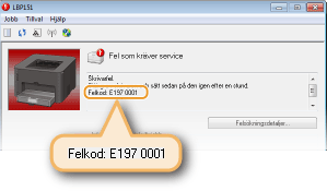 Ett felmeddelande visas i skrivarstatusfönstret om det blir fel vid utskriftsbearbetningen, om enheten inte kan kommunicera eller om något annat fel förhindrar normal drift. Mer information om felmeddelanden finns i listan nedan.