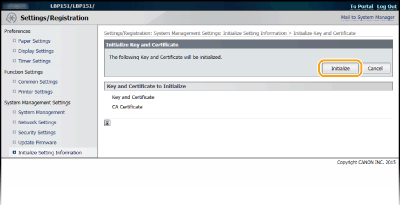 يمكنك إعادة إعدادات أزواج المفاتيح (إعدادات المفاتيح والشهادات) وشهادات المرجع المصدق CA إلى إعدادات المصنع الافتراضية. لاحظ أن أي زوج من أزواج المفاتيح التي سجلتها في الجهاز، وأية شهادات مرجع مصدق CA (باستثناء شهادات المرجع المصدق CA المثبتة مسبقًا) سوف يتم حذفها بواسطة التهيئة.