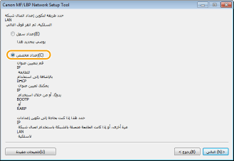 بعد تحويل طريقة التوصيل من شبكة LAN لاسلكية إلى شبكة LAN سلكيةتحتاج لإلغاء تثبيت (إزالة وحذف) برنامج تشغيل الطابعة المثبّت حاليًا، والقيام بتهيئة اتصال الشبكة المحلية السلكية، ومن ثم القيام بإعادة تثبيت برنامج تشغيل الطابعة وفقًا لدليل تثبيت برنامج تشغيل الطابعة دليل تثبيت برنامج تشغيل الطابعة. عند تهيئة اتصال LAN السلكي، قم باختيار [إعداد مخصص] بخصوص طريقة التهيئة.