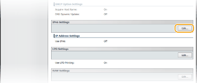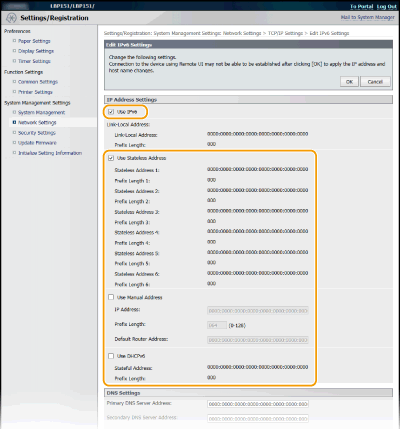 قم باستخدام واجهة المستخدم عن بُعد لتعيين عناوين IPv6. قبل تعيين عناوين IPv6، تأكد من أن عنوان IPv4 قد تم تعيينه بشكل صحيح (استعراض إعدادات الشبكة). يمكنك التسجيل حتى تسعة عناوين من عناوين IPv6 التالية.