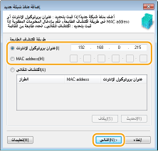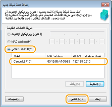 انقر فوق [تحديث]. في حالة استمرار المشكلة، حدد [عنوان بروتوكول الإنترنت] أو [MAC address]، وأدخل عنوان IP أو عنوان MAC الخاص بالجهاز (استعراض إعدادات الشبكة) ثم انقر فوق [التالي].