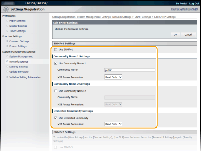 إذا تم تمكين كلا الإصدارين من SNMP، فينصح بأن يتم تعيين إذن الوصول لـ MIB في SNMPv1 إلى [Read Only]. ويمكن تعيين إذن الوصول لـ MIB بشكل مستقل في SNMPv1 وSNMPv3 (ولكل مستخدم في SNMPv3). إن تحديد [Read/Write] (إذن الوصول الكامل) في SNMPv1 يلغي ميزات الأمان القوية التي تميز بروتوكول SNMPv3 لأن معظم إعدادات الجهاز حينئذ يمكن أن يتم الحكم بها باستخدام SNMPv1.