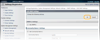 إن SNMP هو بروتوكول لمراقبة أجهزة الاتصالات على الشبكة والتحكم بها باستخدام قاعدة بيانات MIB. الجهاز يدعم SNMPv1 وSNMPv3 المزود بإجراءات أمان محسنة. ويتيح لك ذلك التحقق من حالة الجهاز من خلال الكمبيوتر عند طباعة المستندات أو استخدام واجهة المستخدم عن بُعد. يمكنك تمكين إما SNMPv1 أو SNMPv3 أو كليهما في الوقت نفسه. قم بتحديد الإعدادات لكل إصدار لكي يتناسب مع بيئة الشبكة والغرض من الاستخدام.