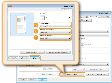 يمكنك تغيير تفاصيل التنسيق مثل الخط وحجم الخط عند طباعة التواريخ، أو أسماء تسجيل الدخول، أو أرقام الصفحات. انقر على[إعدادات التنسيق] على شاشة [خيارات الصفحة] المبينة أعلاه لتحديد التفاصيل.