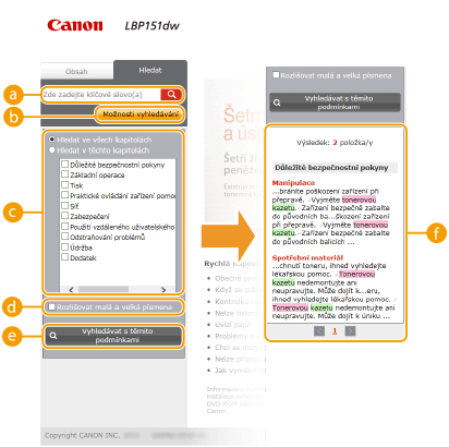 Tento prvek slouží k vyhledávání v jednotlivých kapitolách. Hledání tak může být efektivnější, jestliže dokážete odhadnout kapitoly obsahující hledané téma.