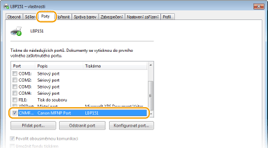 Pokud je v možnosti [Popis] u vybraného portu uvedena položka [Canon MFNP Port] a zařízení a počítač jsou ve stejné podsíti, připojení bude zachováno. Není třeba přidat nový port. Pokud se zobrazí položka [Standard TCP/IP Port], je třeba přidat nový port. Konfigurace portů tiskáren