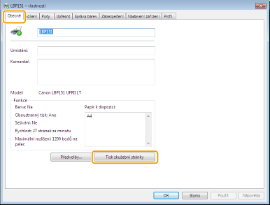 Na kartě [Obecné] klikněte na možnost [Tisk zkušební stránky].