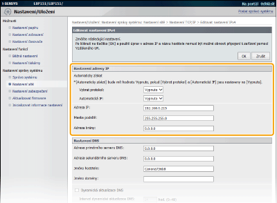 Vyberte možnost [Vypnuto] pro [Vybrat protokol] a [Automatická IP].