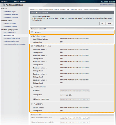 K nastavení adres IPv6 použijte vzdálené uživatelské rozhraní. Před nastavením adres IPv6 ověřte, že je správně nastavena adresa IPv4 (Zobrazení nastavení sítě). Můžete uložit až devět následujících adres IPv6.