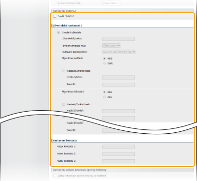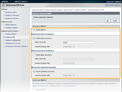 SNMP (Simple Network Management Protocol) je protokol určený k monitorování a ovládání komunikačních zařízení v síti prostřednictvím databáze MIB (Management Information Base). Zařízení podporuje protokol SNMPv1 a protokol SNMPv3 s rozšířeným zabezpečením. Tyto protokoly umožňují kontrolovat stav zařízení z počítače při tisku dokumentů nebo použití vzdáleného uživatelského rozhraní. Můžete povolit protokol SNMPv1 nebo protokol SNMPv3, případně oba dva současně. Zadejte nastavení pro každou verzi podle prostředí sítě a účelu použití.