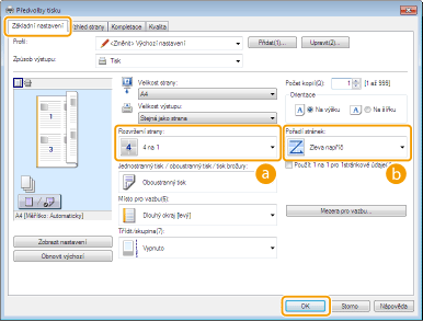 Můžete tisknout více stránek na jeden list. Pomocí možnosti [4 na 1] nebo [9 na 1] můžete například vytisknout čtyři nebo devět stránek na jeden list. Tuto funkci použijte, pokud chcete šetřit papírem nebo si dokument prohlédnout s použitím miniatur.