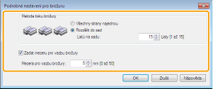 [Rozdělit do sad]: Vytiskne se více sad rozdělených podle čísel stránek zadaných v nabídce [Listů na sadu]. Každou sadu svažte a poté je spojte do jedné brožury. Tuto možnost vyberte v případě, že dokument obsahuje takový počet stránek, který nelze svázat do jediné brožury.