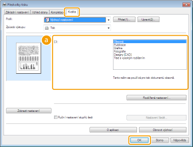 Vyberte možnost odpovídající typu dokumentu a účelu tisku. V případě obecného použití vyberte možnost [Obecná]; chcete-li tisknout fotografie v optimální kvalitě, vyberte možnost [Fotografie].