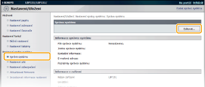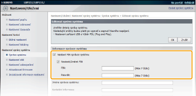Práva pro přístupu správce jsou potřebná při změně nastavení zařízení ze vzdáleného uživatelského rozhraní. Po přihlášení jako správce použijte následující postup k nastavení kódu PIN (heslo správce systému). Heslo správce systému je pro zabezpečení zařízení velmi důležité. Dbejte na to, aby heslo správce systému znali jen pověření správci systému.