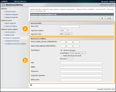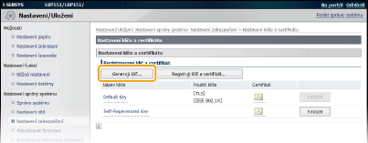 Pokud šifrovaná komunikace prostřednictvím protokolu TLS vyžaduje pár klíčů, je možné ho vygenerovat pomocí zařízení. Protokol TLS lze použít pro přístup k zařízení pomocí vzdálené uživatelské rozhraní. Lze uložit až pět párů klíčů, včetně předinstalovaných párů. Certifikáty podepsané svým držitelem se používají s páry klíčů vygenerovanými pro „síťovou komunikaci“. Pomocí možnosti „Klíč a žádost o podepsání certifikátu (CSR)“ můžete požádat o digitální certifikát vystavený certifikační autoritou pro pár klíčů vygenerovaný tímto zařízením.