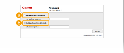 Vyberte možnost [Režim správce systému] nebo [Režim obecného uživatele].
