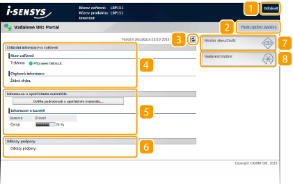 Zobrazí aktuální stav zařízení a informace o chybě. Pokud dojde k chybě, zobrazí se také odkaz na stránku s informacemi o chybě.