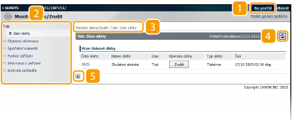 Zobrazí stránku [Monitor stavu/Zrušit]. Můžete ji používat ke kontrole stavu aktuální tiskové úlohy, zrušení zpracování tisku a k zobrazení historie tiskových úloh.
