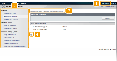 Zobrazí stránku [Nastavení/Uložení]. Když jste přihlášení v režimu správce systému, můžete pomocí této stránky měnit nastavení zařízení.