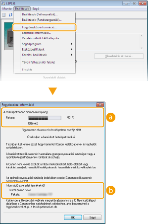 A festékkazettában maradt festék mennyiségét a [Fogyóeszköz-adatok] segítségével ellenőrizheti a Távoli felhasználói felület Portál oldalán (a főoldalon). Portál oldal (főoldal)