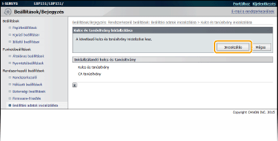 Visszaállíthatja gyári alaphelyzetbe a kulcspárok (kulcs- és tanúsítványbeállítások) és a CA-tanúsítványok beállításait. Ne feledje, hogy az alaphelyzetbe állítás töröl minden, a gépen Ön által bejegyzett kulcspárt és CA-tanúsítványt (kivéve az előre telepített CA-tanúsítványokat).