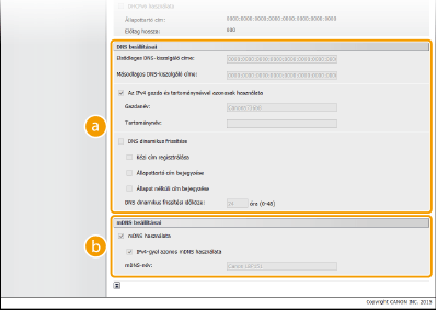 Ha bejelöli a jelölőnégyzetet, akkor a készülék automatikusan frissíti a DNS-rekordokat, amikor a készülék IP-címe és állomásneve közötti kapcsolat megváltozik (például DHCP-környezetben). A [Kézi cím regisztrálása], [Állapottartó cím bejegyzése] és [Állapot nélküli cím bejegyzése] jelölőnégyzetek közül a megfelelő vagy a megfelelők bejelölésével adja meg a DNS-kiszolgálón bejegyezni kívánt címeket. A frissítések időközének megadásakor adjon meg egy időtartamot órákban a [DNS dinamikus frissítési időköze] szövegmezőben. Ha nem szeretne dinamikus frissítést használni, akkor törölje a jelet a jelölőnégyzetből. [mDNS beállításai][mDNS használata]