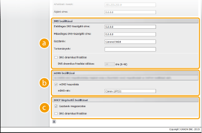 Ha bejelöli a jelölőnégyzetet, akkor a készülék automatikusan frissíti a DNS-rekordokat, amikor a készülék IP-címe és állomásneve közötti kapcsolat megváltozik (például DHCP-környezetben). A frissítések időközének megadásakor adjon meg egy időtartamot órákban a [DNS dinamikus frissítési időköze] szövegmezőben. Ha nem szeretne dinamikus frissítést használni, akkor törölje a jelet a jelölőnégyzetből. [mDNS beállításai][mDNS használata]