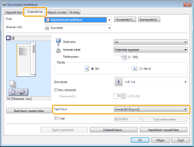 Ha beszennyeződik a kinyomtatott lapok festékével vagy ha a festék lejön az oldalrólHa érdes felületű papírt használ vagy a kendők bepiszkolódnak a festékkel, a [Papírtípus] értékét állítsa [Bankpostapapír 1 [60-90 g/m2]], [Bankpostapapír 2 [91-120 g/m2]] vagy [Bankpostapapír 3 [121-163 g/m2]] értékre.