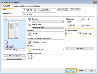 A nyomatokat előre beállított méretarány szerint, például A5 méretről A4 méretre, vagy 1%-os lépésközzel meghatározott egyéni méretarány szerint nagyíthatja, illetve kicsinyítheti.