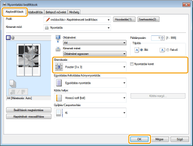 Kétoldalas nyomtatás választása esetén nem választhatók poszterméret-beállítások. Először válassza az [Egyoldalas nyomtatás] lehetőséget az [Egyoldalas/kétoldalas/könyvnyomtatás] mezőben, majd ezután válasszon poszterméret-beállítást.