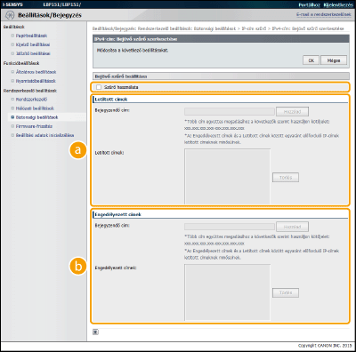 Adjon meg egy IP-címet (vagy egy IP-címtartományt) a [Bejegyzendő cím] szövegmezőben, és kattintson a [Hozzáad] lehetőségre.