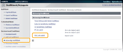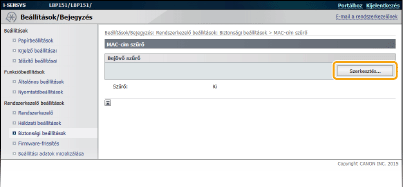 Adjon meg egy MAC-címet a [Bejegyzendő cím] szövegmezőben, majd kattintson a [Hozzáad] gombra. Engedélyezi a (fogadott) kommunikációt azokkal az eszközökkel, amelyek MAC-címe be van jegyezve és megakadályozza a kommunikációt minden más MAC-címmel rendelkező eszközzel.