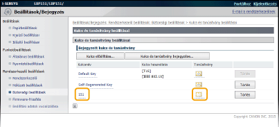 A kulcspár nem törölhető, ha éppen valamilyen célra használják, például amikor a [TLS] vagy az [IEEE 802.1X] elem jelenik meg a [Kulcs használata] részben. Ebben az esetben a kulcspár törlése előtt ki kell kapcsolni a funkciót vagy le kell cserélnie a kulcspárt. Az előre telepített hitelesítésszolgáltatói tanúsítványok nem törölhetők.