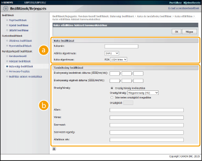 Ha a TLS (Transport Layer Security) megoldáson keresztül folytatott titkosított kommunikációhoz kulcspárra van szükség, akkor az előállítható a készülékkel. A TLS akkor használható, amikor a készüléket egy Távoli felhasználói felülettel éri el. Legfeljebb öt kulcspár jegyezhető be, beleértve az előre telepített párokat. Az önaláírt tanúsítványok a „Hálózati kommunikáció” alatt létrehozott kulcspárokkal használtak. „Kulcs és a tanúsítvány aláírási kérelemmel (CSR)” kérhet hitelesítésszolgáltató által kiadott digitális tanúsítványt a készülék által előállított kulcspárhoz.