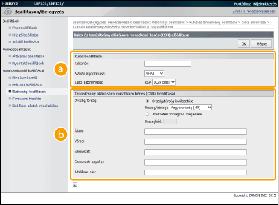 [Tanúsítvány aláírására vonatkozó kérés (CSR) beállításai]