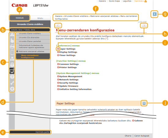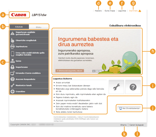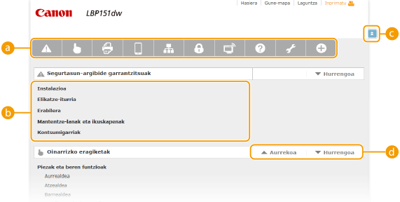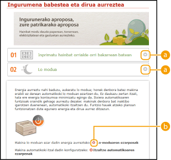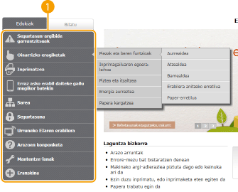 Gaien orrialdeak makina nola konfiguratu eta erabili azaltzen dute.