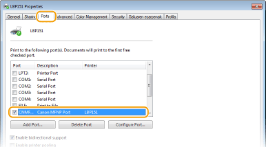 Hautatutako atakaren [Description] [Canon MFNP Port] bada eta makina eta ordenagailua azpisare berean badaude, konexioak jarraitu egingo du. Ez da beharrezkoa beste ataka bat gehitzea. [Standard TCP/IP Port] baldin bada, beste ataka bat gehitu behar da. Inprimatzeko atakak konfiguratzen
